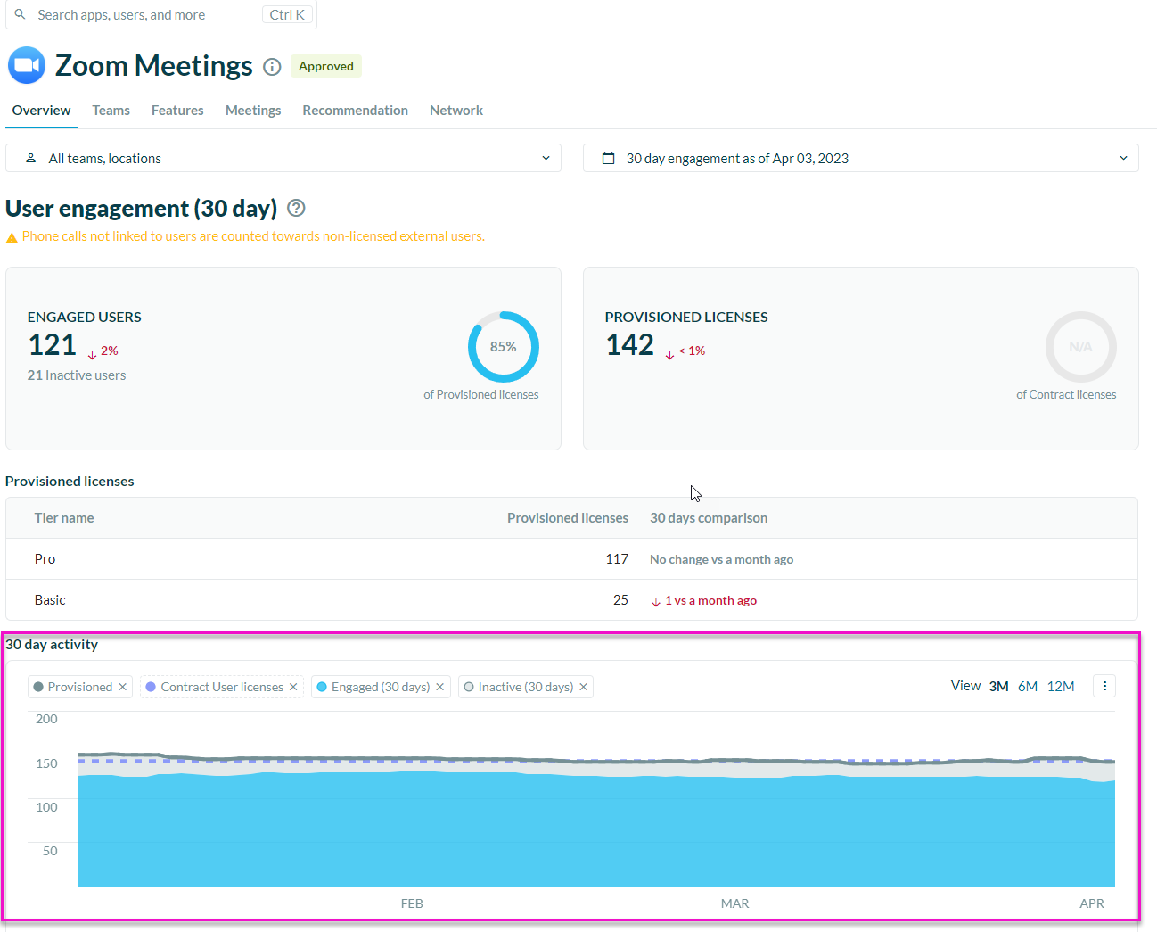 The closer the distance between the gray line and the blue shaded area denotes how many licenses you are provisioned for versus engaged users.