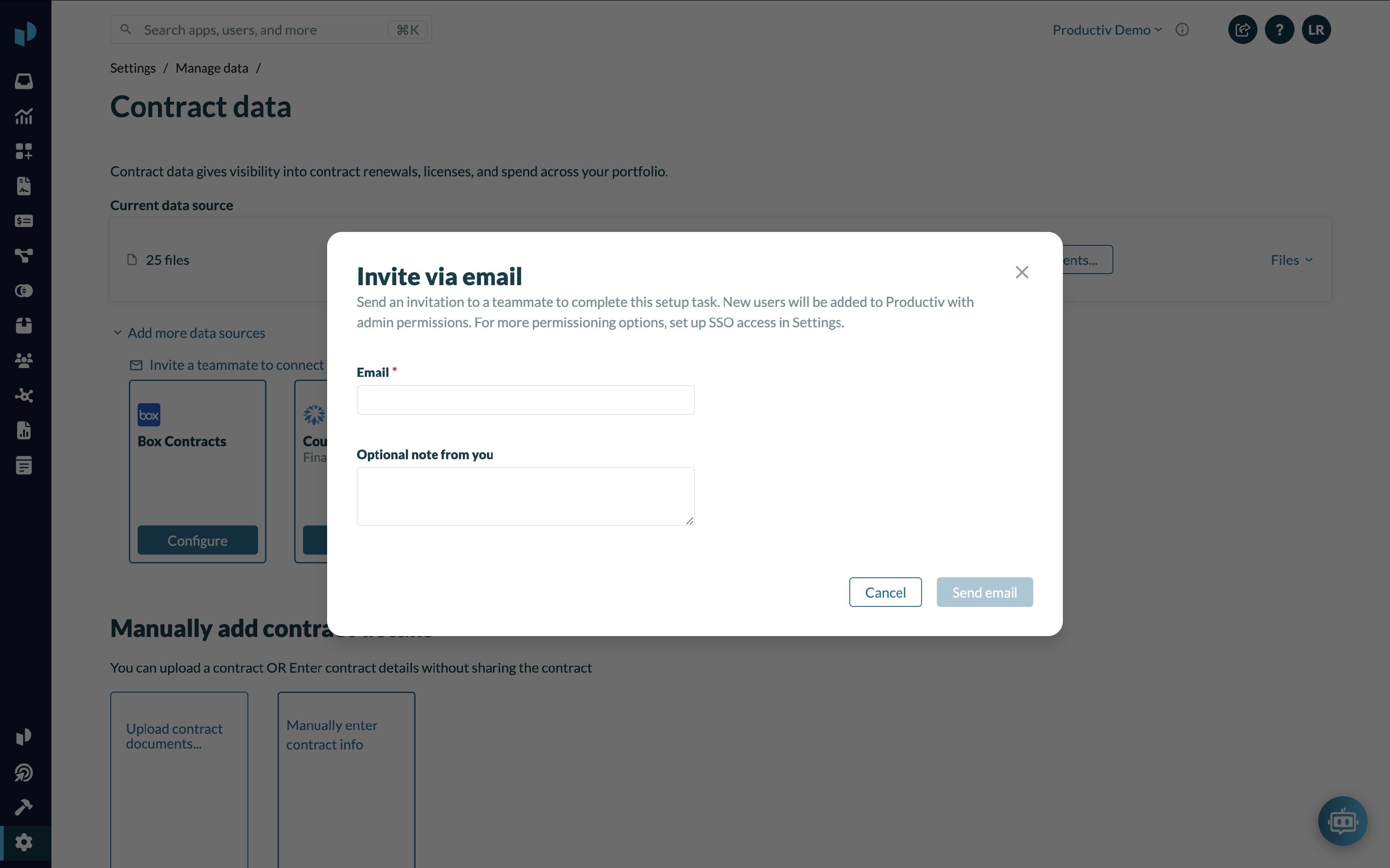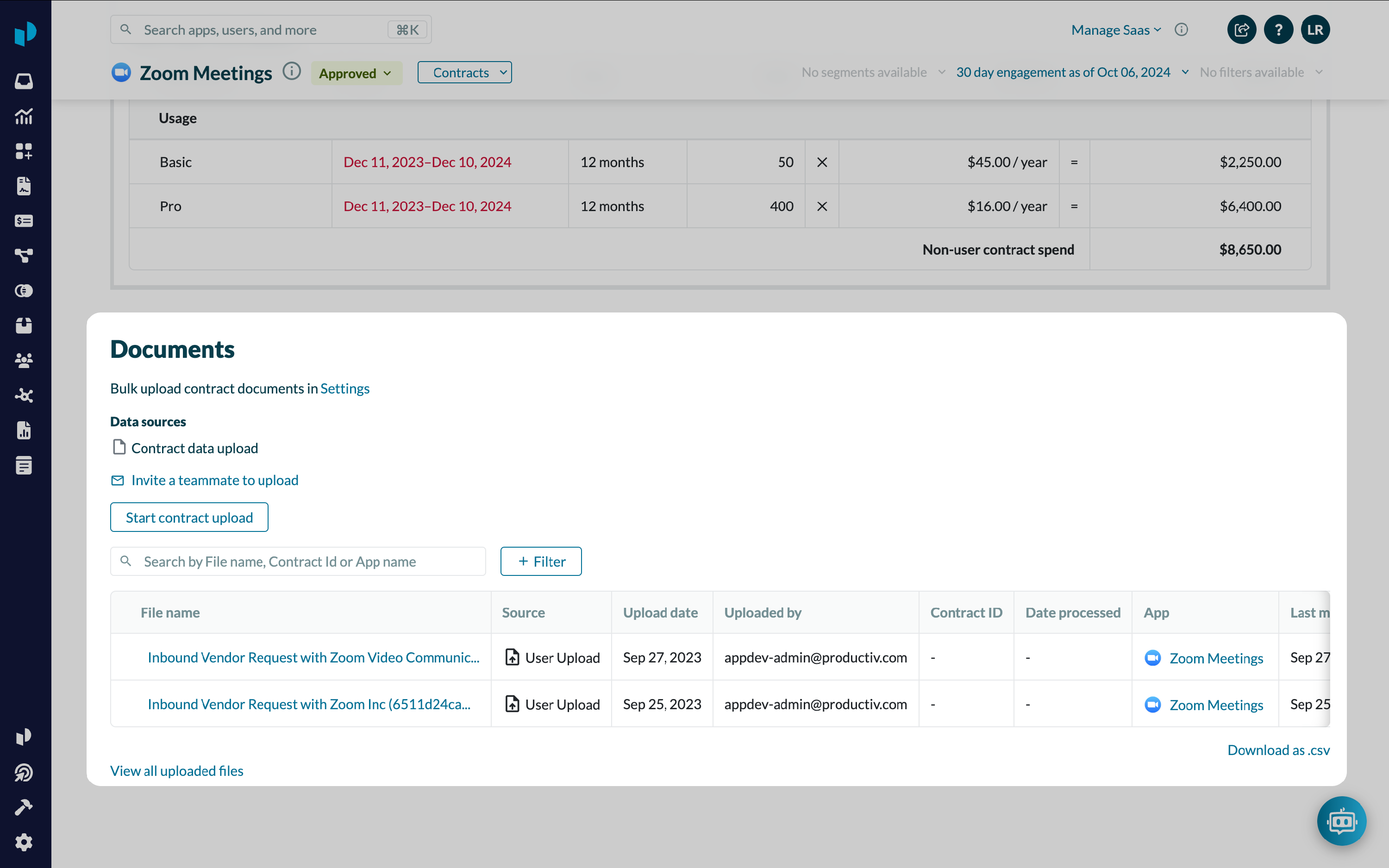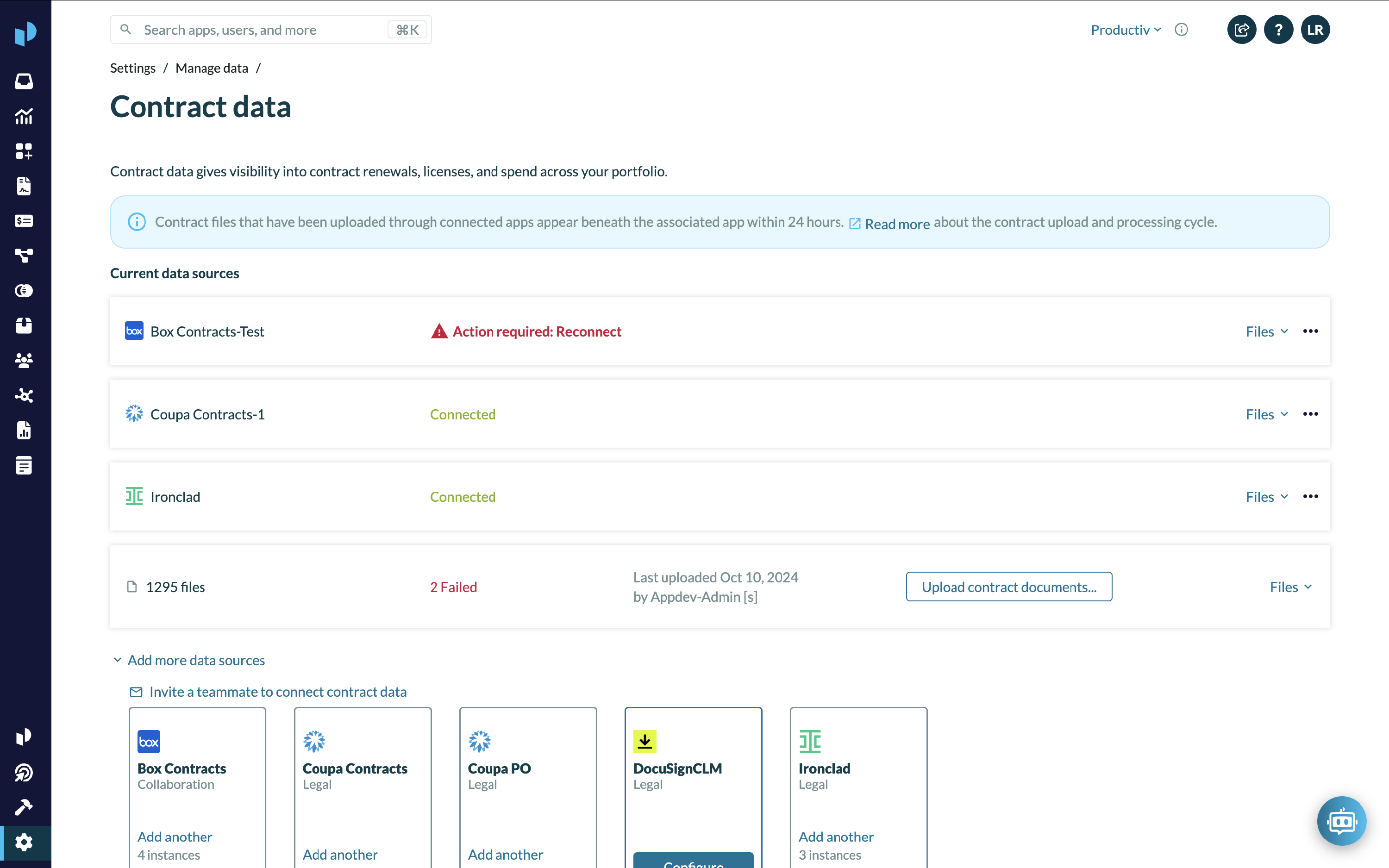 Use this link to upload up to 200 contracts to Productiv using an active data source, OR to set up an existing contract data upload engine. You can then use that engine to seamlessly upload your contracts to Productiv.