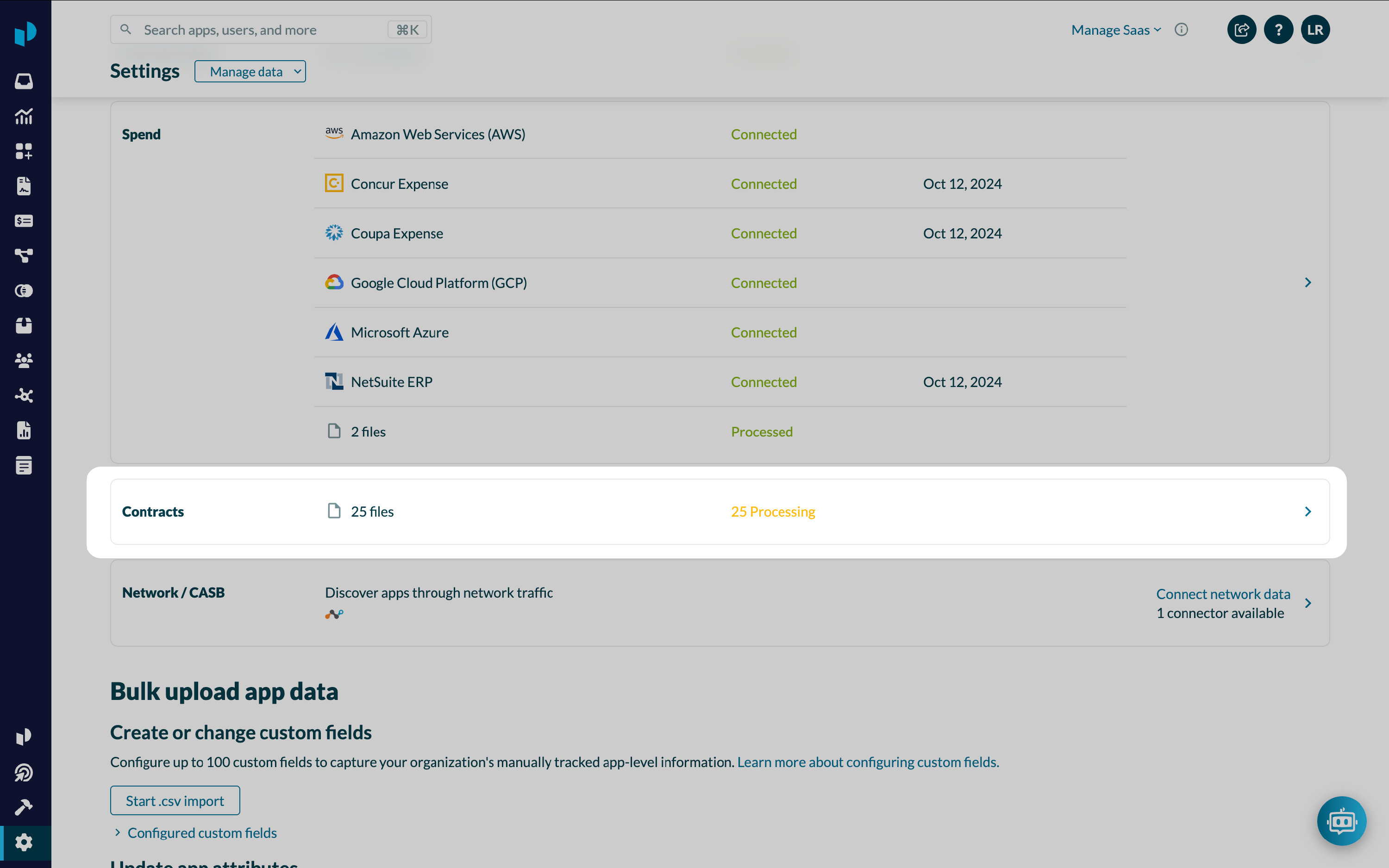 Productiv navigates you to the Settings workflow's Manage data / Contract data page. This page shows whether an upload engine has already been set up for your use, and if so, how many contracts have been uploaded that way thus far.