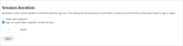 - Select Keep users signed in for infinite sessions or Sign out users after a specific number of days to define more limited sessions.