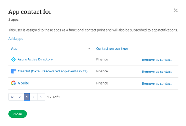 By assigning a user as an app contact, that person will also automatically be subscribed to notifications about the app, unless the contact person type is Vendor or Other.