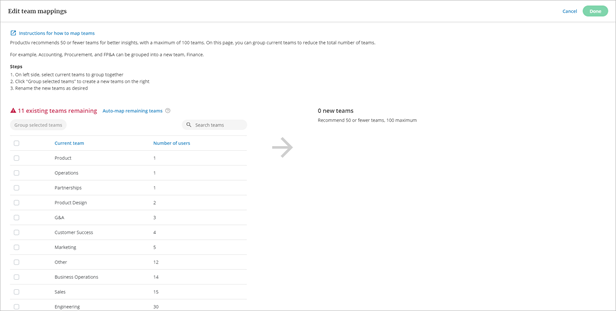 You can have Productiv automatically map your existing teams using their existing team names, by selecting Auto-map remaining items. If you have more than 100 teams, Productiv keeps the largest 99 teams as individual teams, and combines the remaining teams into one group.