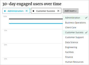 Each selected team shows as a line plotting the percentage of active users over the selected time period.
