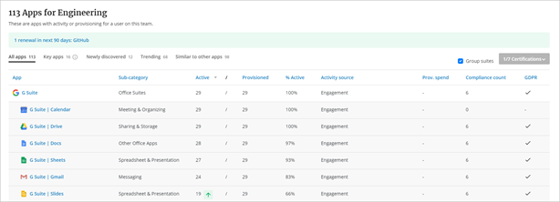 - Active - the number of users from this team identified as active in the app in the selected time window; numbers in italics are unique logins from SSO login data if engagement data is not available for that app
