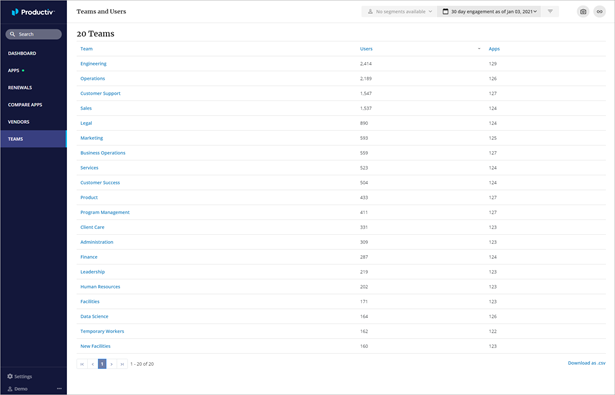 Understand app footprint and usage for teams so IT and team leads can sync on app needs and budgeting. Identify high-performing teams and users as models for training and engagement programs.