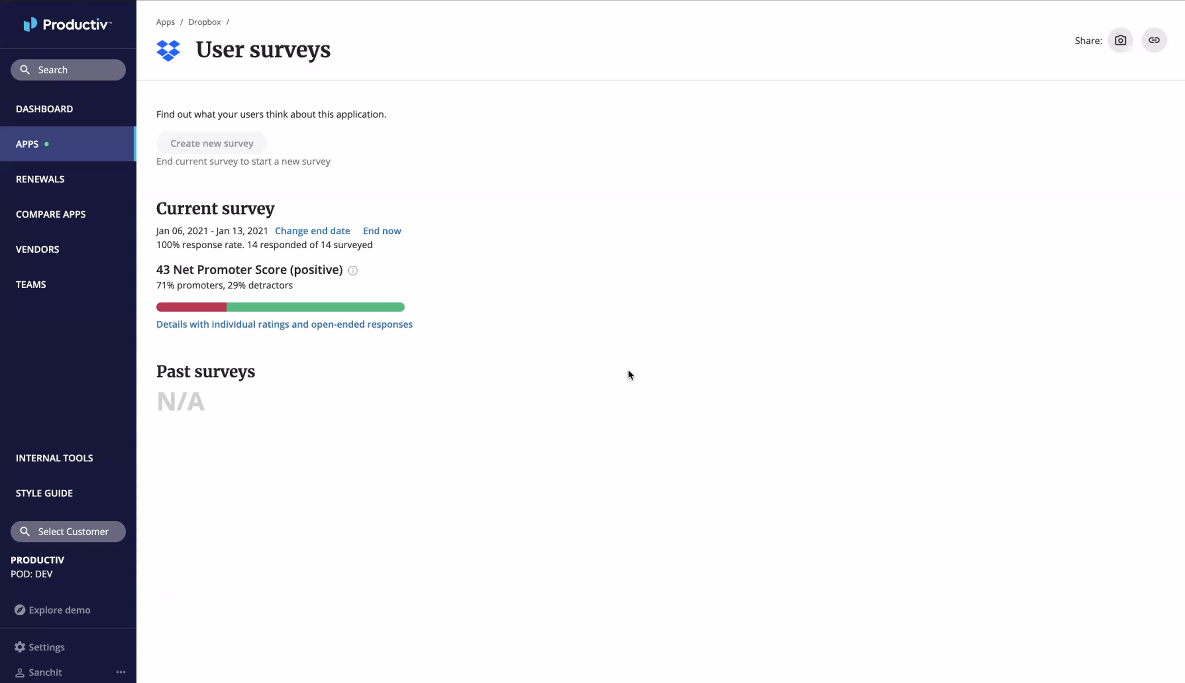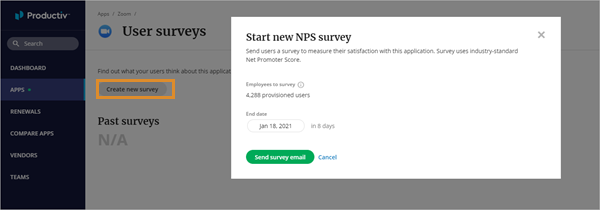 The Productiv User surveys function sends an industry-standard NPS survey to help identify what employees think about an app. This enables the SaaS management team to encourage and improve employee productivity. Once at least five employees have responded to the survey, you can easily review survey results.
