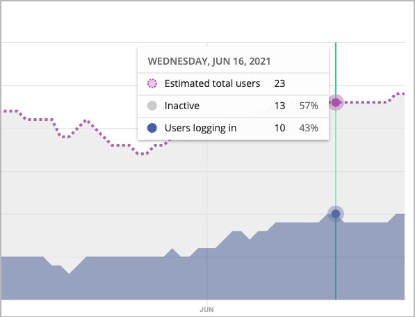 To help with tracking app usage, view the number of unique logins from SSO data as compared to the number of estimated total users for the selected window of time.