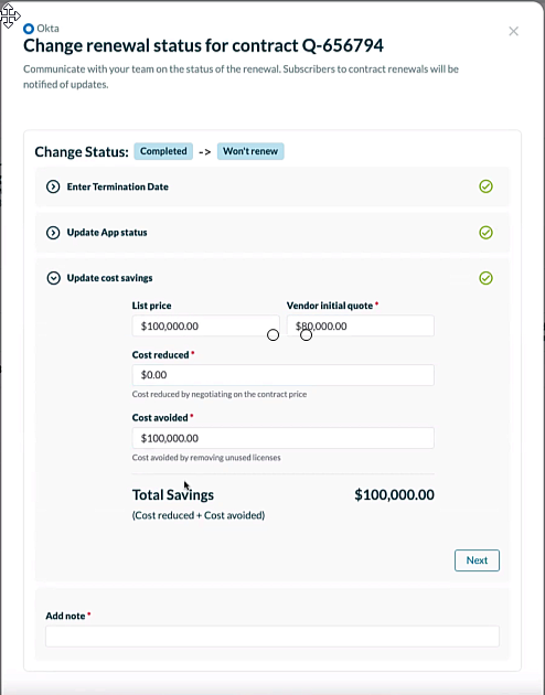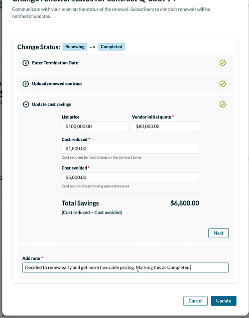 When you change the status to completed or won’t renew you have the opportunity to capture the cost savings. Cost savings is a combination of cost reduced and cost avoided. This is a free text field that will support amounts in your default currency.