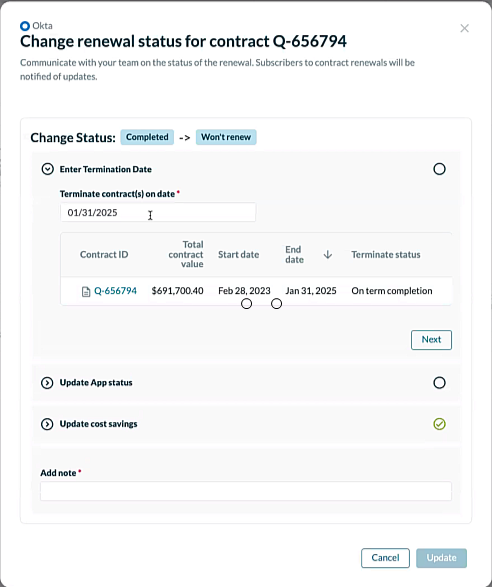 - In terminal states (Completed & Won't Renew) you can also capture the termination date of the existing contract, the new contract or application status, and the cost savings