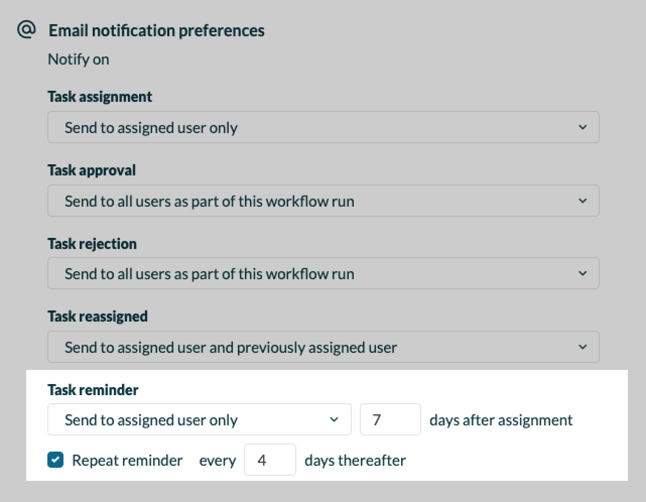 Automate slack and email reminders for workflow steps to ensure assignees stay informed about outstanding tasks and help keep deadlines on track. Manage reminders by accessing the workflow's collaboration settings. Reminders can be set for a single notification or repeated at a specified interval.