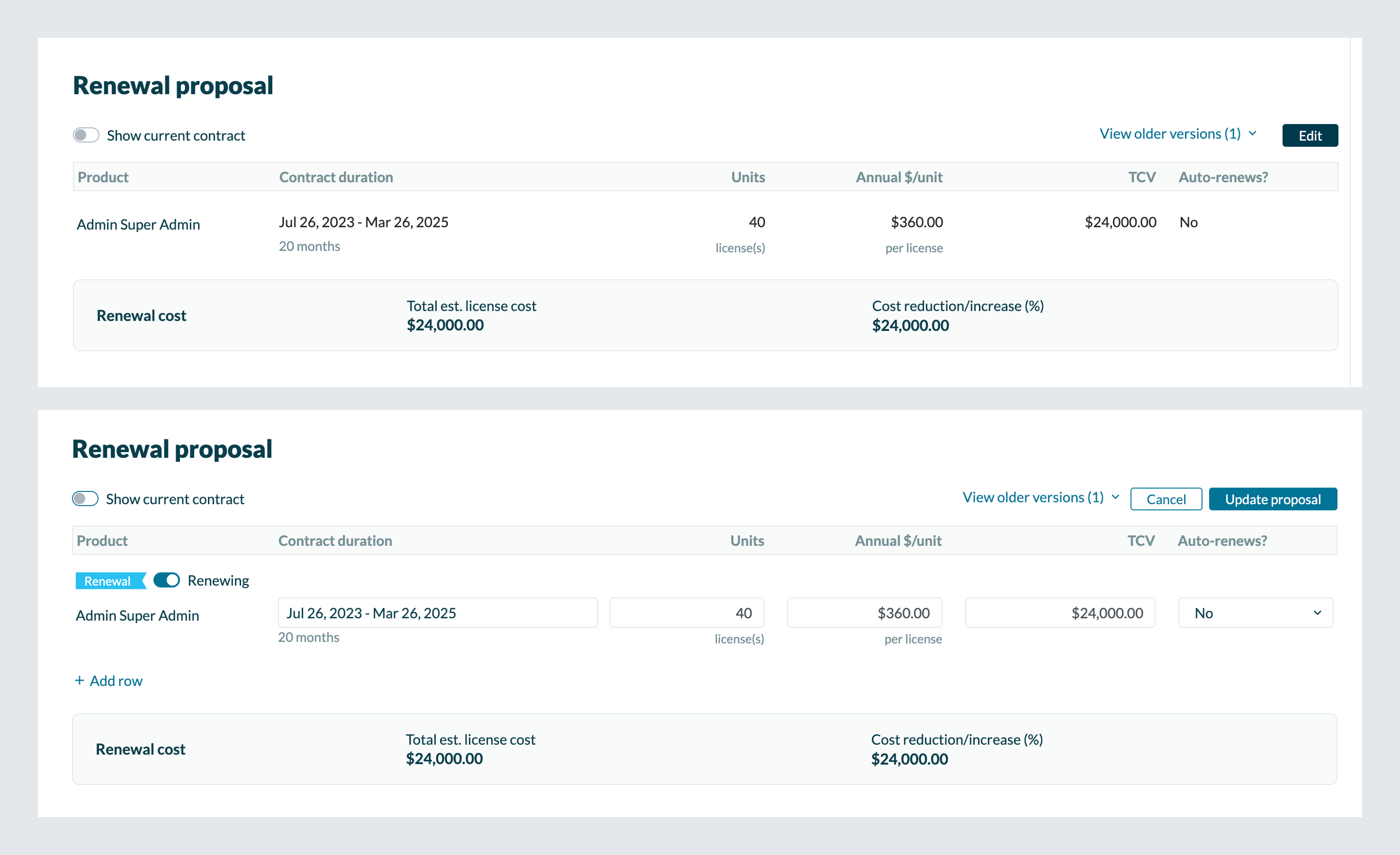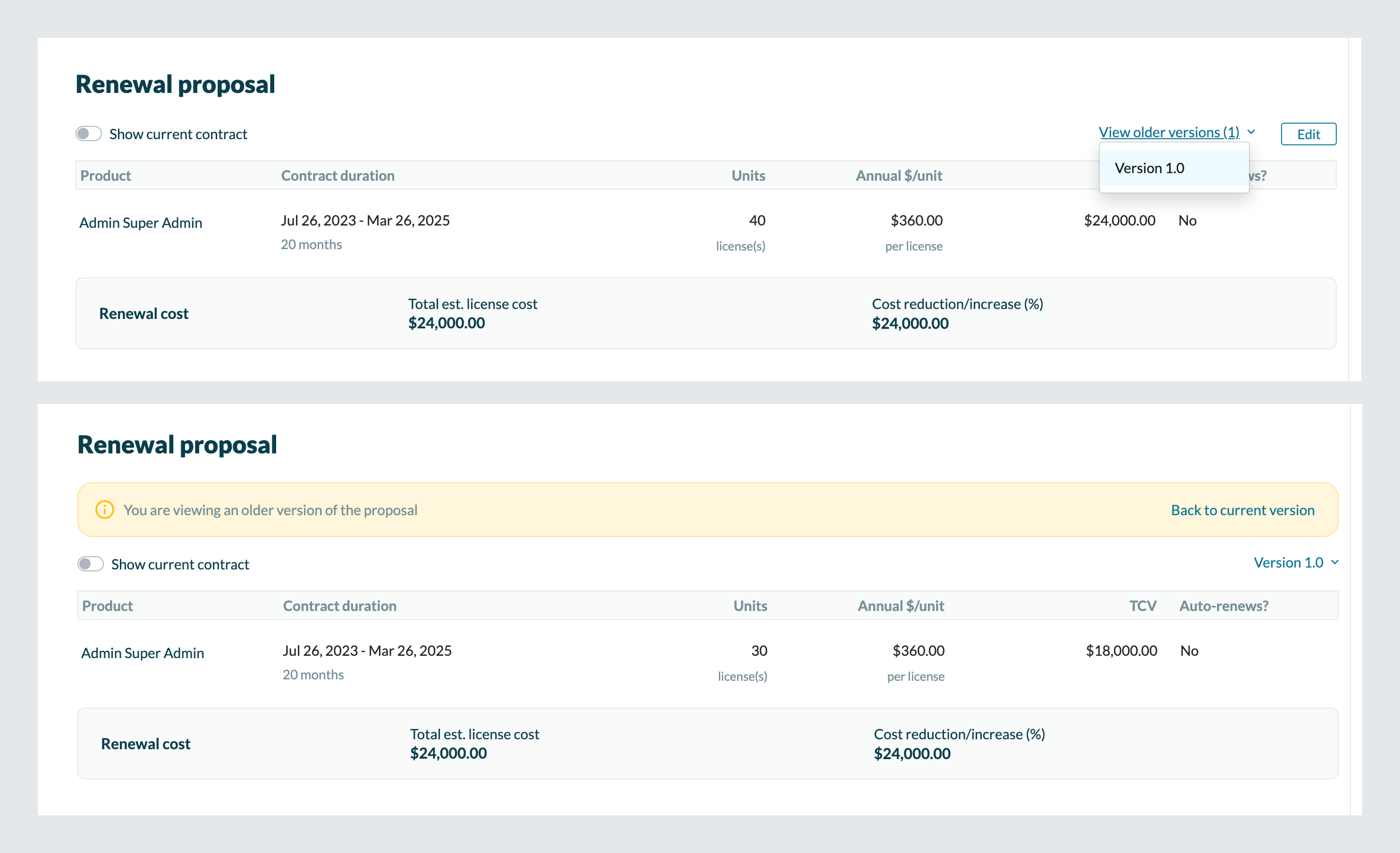 Users can now edit the renewal proposal at any step in the workflow, without being assigned the current step. Any user with access to the workflow can edit the renewal proposal. As always, edits to the proposal send out notifications to watchers involved in the workflow and previous versions of the proposal are available to view.