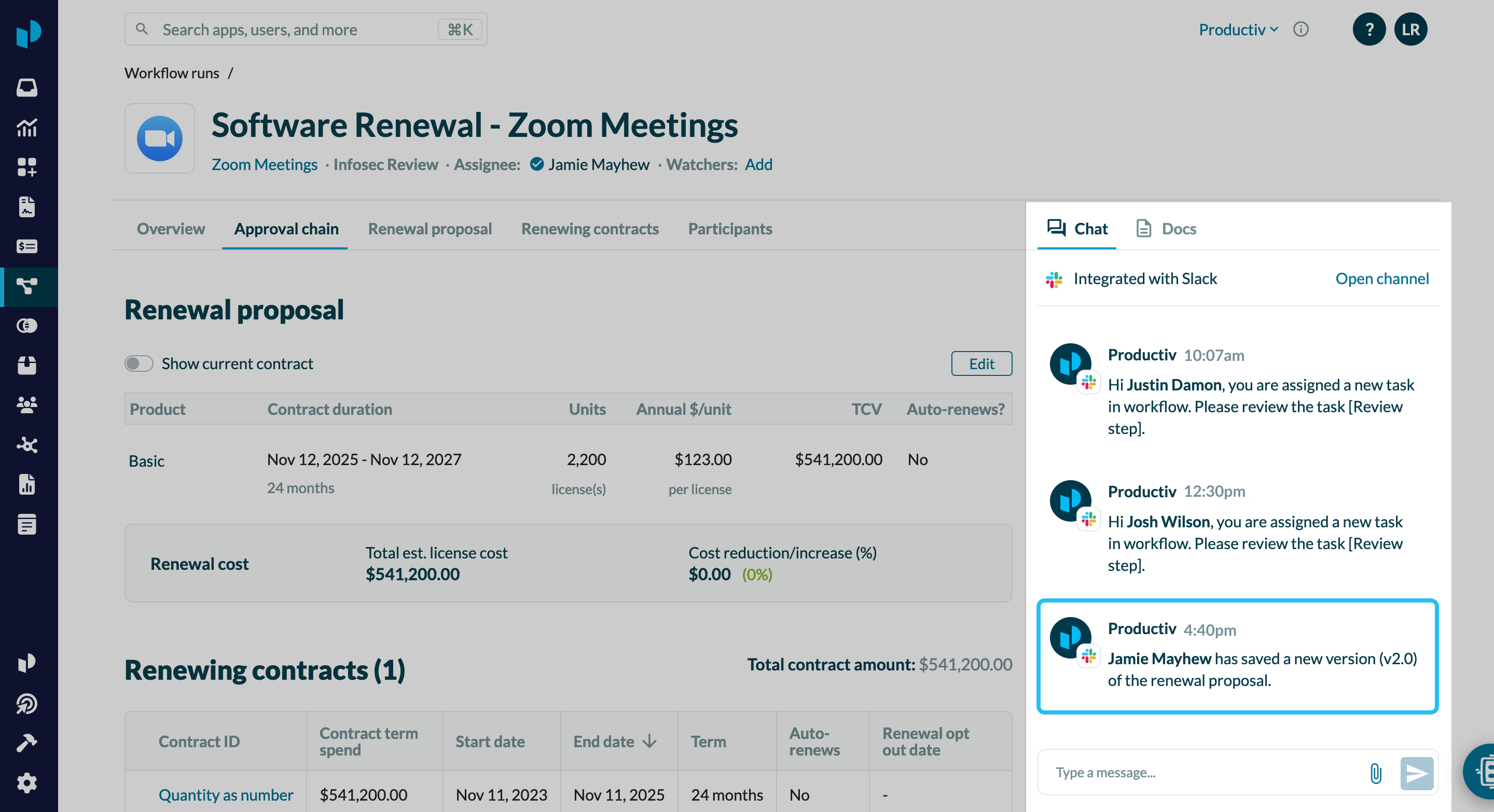 All updates to the renewal proposal will send out notifications via Email, Slack, or Teams depending on your workflow configuration and always be available in the workflow chat.