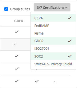 Stay on top of compliance coverage and find non-compliant apps for this team using the Certifications filter. To view compliance certification details for this team’s apps, select a certification type from the Certifications filter. The certification(s) you select will be shown with a checkmark and the certification selected will be shown as a column in the table.