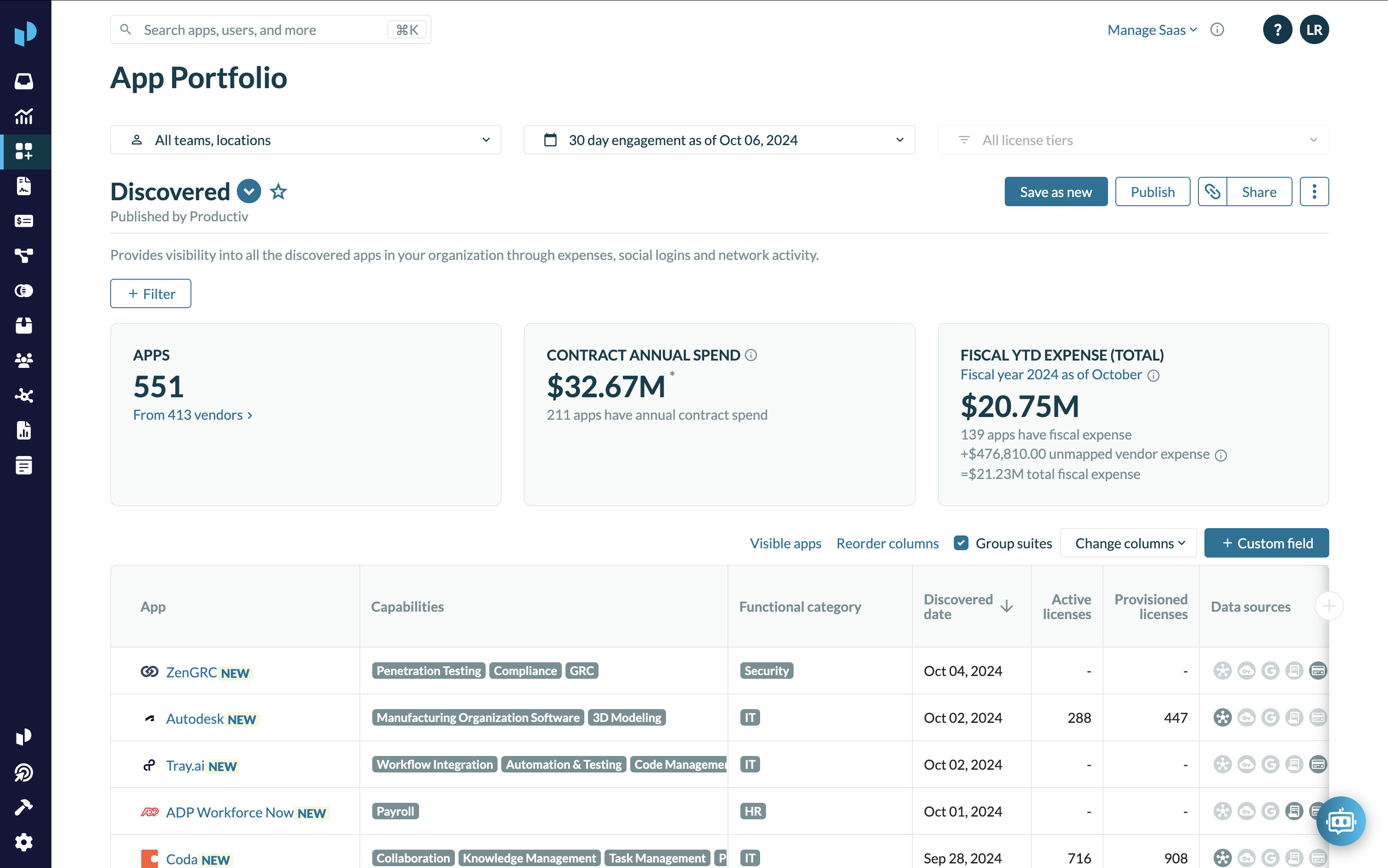 To examine Discovered apps more closely, click Review discovered apps. Productiv displays the App List Discovered apps view.