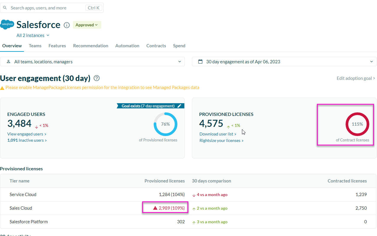 If you were the IT contact or subscripted to alerts for Salesforce, you would have received a slack or email that you were overprovisioned. - Select the Recommendation tab.